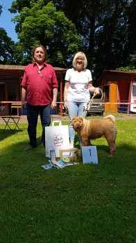 Z 95 šarpejů byl jediný pes černé barvy, jinak se vystavovali hafíci v barvě zlaté ve všech jejích odstínech několik červených a krémových jedinců. Někteří jedinci v krémových barvách obsadili první místa ve svých třídách a v tu chvíli jsem si uvědomila, že Beauty je vlastně jediná fena krémové barvy v ČR, která to za celou dobu chovu někam "dotáhla" a musím říct, že jsem na tu svoji plyšovou holku náležitě pyšná. Ne jedinkrát jsem se totiž setkala s názorem, že krémová barva je nežádoucí a přitom je uznaná. Vítězem plemene se stala červená fenka Qinrose Red Velvet For Bullpei.